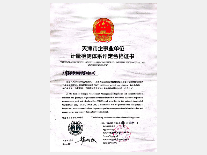 天津市企事業(yè)單位計(jì)量檢測體系評定合格證書